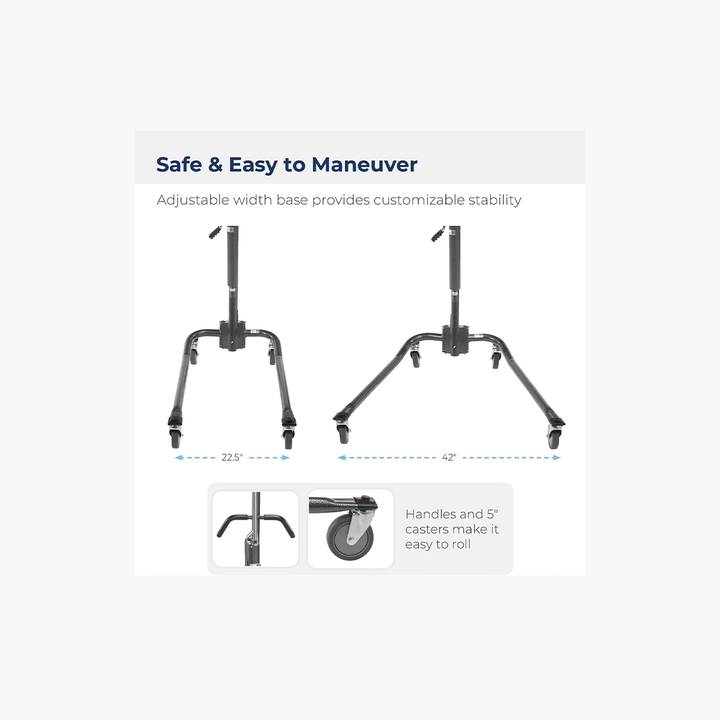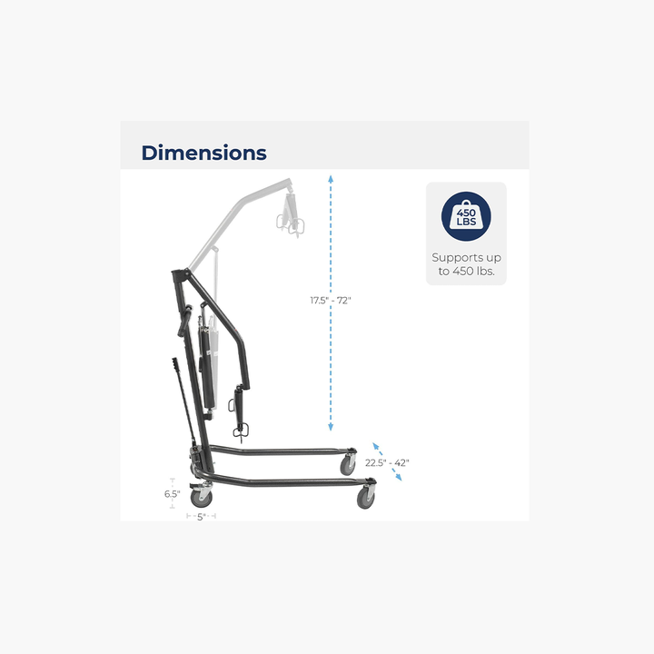 - Dimensions: The patient lift for home has to be assembled and has a base width of 42 inches and height ranging from 17.5-62 inches with a weight capacity of 450 lbs