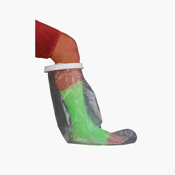 The Leg Cast Protector keeps water from casts or bandages when showering or bathing. It has a reusable long plastic cast and bandage protector 7" in diameter. The plastic ring and diaphragm create a tight seal that prevents water from entering inside.