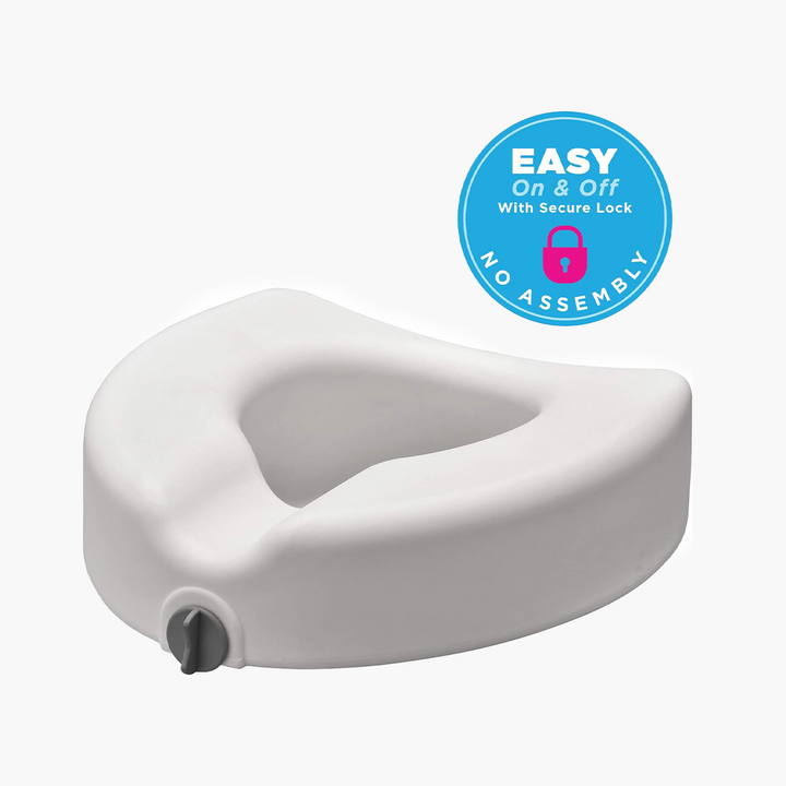 - ON & OFF FRONT LOCK secures the raised toilet seat to most brands of toilet seats - both Standard and Elongated (see SIZING).