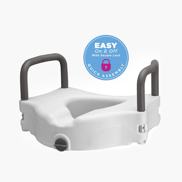 - ON & OFF FRONT LOCK secures the raised toilet seat to most brands of toilet seats - both Standard and Elongated (see SIZING).