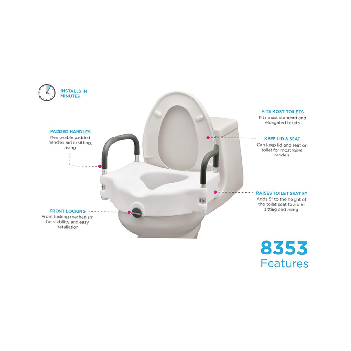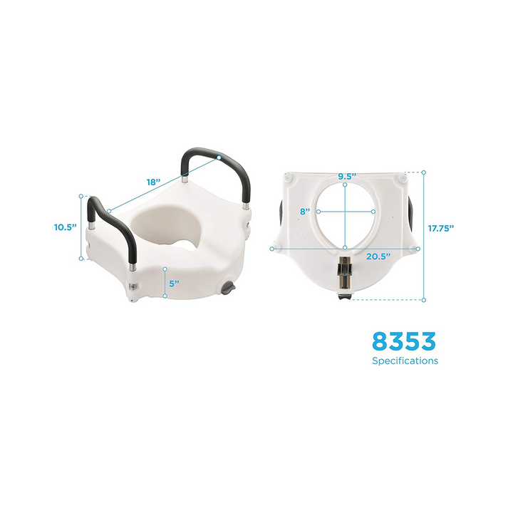 - IDEAL SOLUTION to aid individuals getting on and off the toilet by raising the toilet seat 5” and providing padded handles for support, leverage and safety. Seat type is Plastic