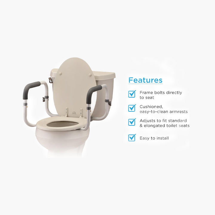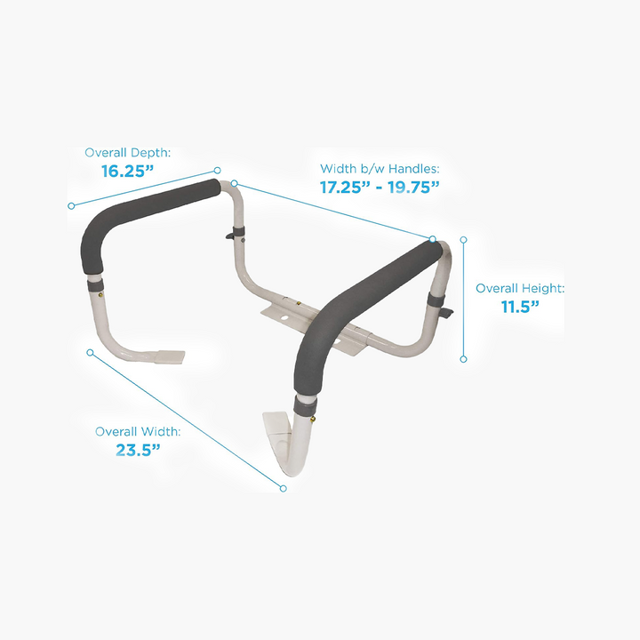 - HANDRAILS TO SUPPORT GETTING ON & OFF THE TOILET is vital to bathroom safety, fall prevention, living independently and recovery. It also reduces the daily physical strain of sitting and standing on and off the toilet. The width between the arms can easily adjust with a push button from 17.25” – 19.75”. Made of durable and lightweight rust-resistant aluminum, weighs only 4 lbs. and has a 300 lb. weight capacity.
